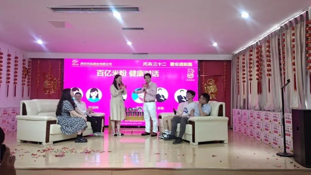 為更直觀地了解光友薯類健康主食,本次活動(dòng)還特別邀請(qǐng)五位嘉賓上臺(tái)與鄒光友董事長(zhǎng)現(xiàn)場(chǎng)健康對(duì)話,對(duì)話的嘉賓分別是綿陽(yáng)城市學(xué)院雙創(chuàng)中心主任李衡、綿陽(yáng)市靖華節(jié)能環(huán)??萍级麻L(zhǎng)王華、四川敬科智能裝備科技副總經(jīng)理肖飛雨、綿陽(yáng)西城大學(xué)生創(chuàng)新創(chuàng)業(yè)園創(chuàng)業(yè)導(dǎo)師杜佳林、綿陽(yáng)城市學(xué)院雙創(chuàng)中心何愛(ài)清,與會(huì)嘉賓在這里共同探討米粉行業(yè)的未來(lái)發(fā)展趨勢(shì)及健康飲食的重要性,共享基地帶動(dòng)大學(xué)生創(chuàng)新創(chuàng)業(yè)發(fā)展。