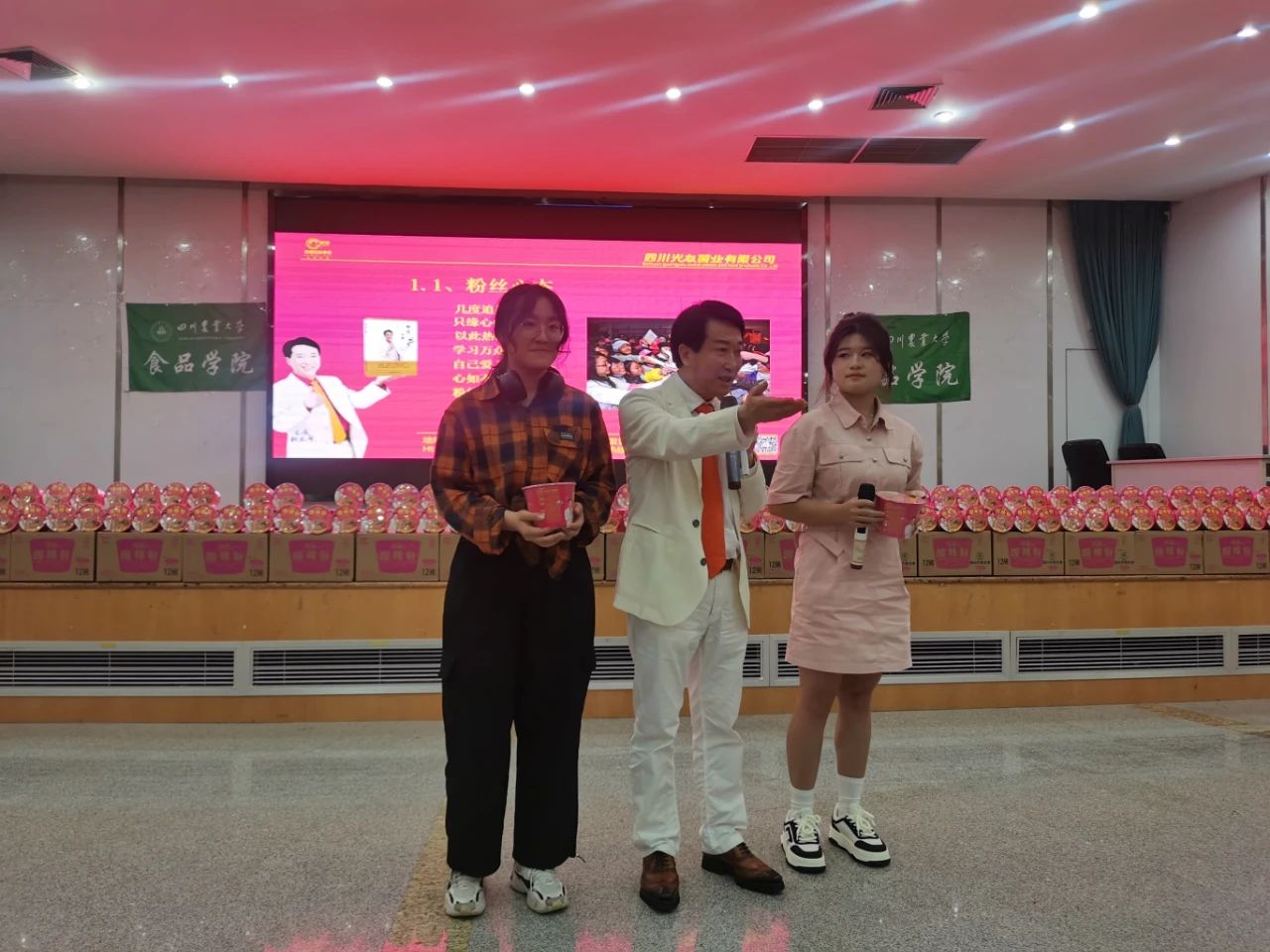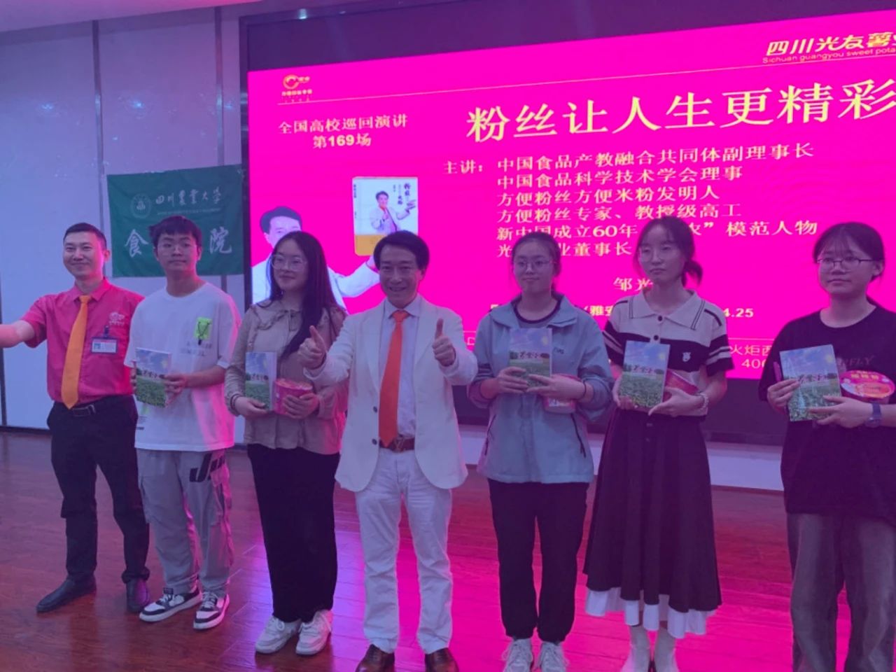 4月25日,陽光曜靈,和風(fēng)容與。正是麗日當(dāng)空時(shí),光友薯業(yè)走進(jìn)了綠意盎然、洋溢著青春活力的四川農(nóng)業(yè)大學(xué)食品學(xué)院,開展了校企深化合作交流座談會(huì),組織考察校區(qū)各食堂、超市,中國(guó)食品產(chǎn)教融合共同體副理事長(zhǎng)、中國(guó)食品科學(xué)技術(shù)學(xué)會(huì)理事、方便粉絲方便米粉發(fā)明人、方便粉絲專家、教授級(jí)高工、新中國(guó)成立60年“三農(nóng)”模范人物、光友薯業(yè)創(chuàng)始人、光友薯業(yè)董事長(zhǎng)鄒光友鄒光友成功舉行了全國(guó)高校第169場(chǎng)創(chuàng)業(yè)勵(lì)志演講。
