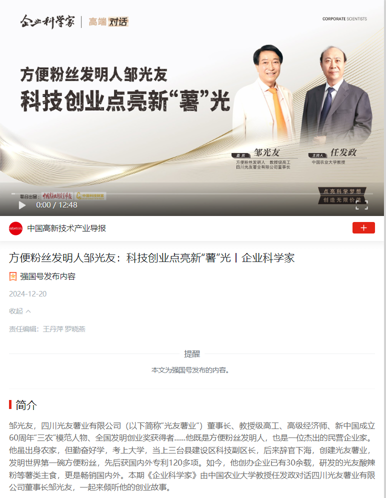 轉(zhuǎn)載學(xué)習(xí)強(qiáng)國(guó)中國(guó)高新技術(shù)產(chǎn)業(yè)導(dǎo)報(bào)——方便粉絲發(fā)明人鄒光友:科技創(chuàng)業(yè)點(diǎn)亮新“薯”光丨企業(yè)科學(xué)家
